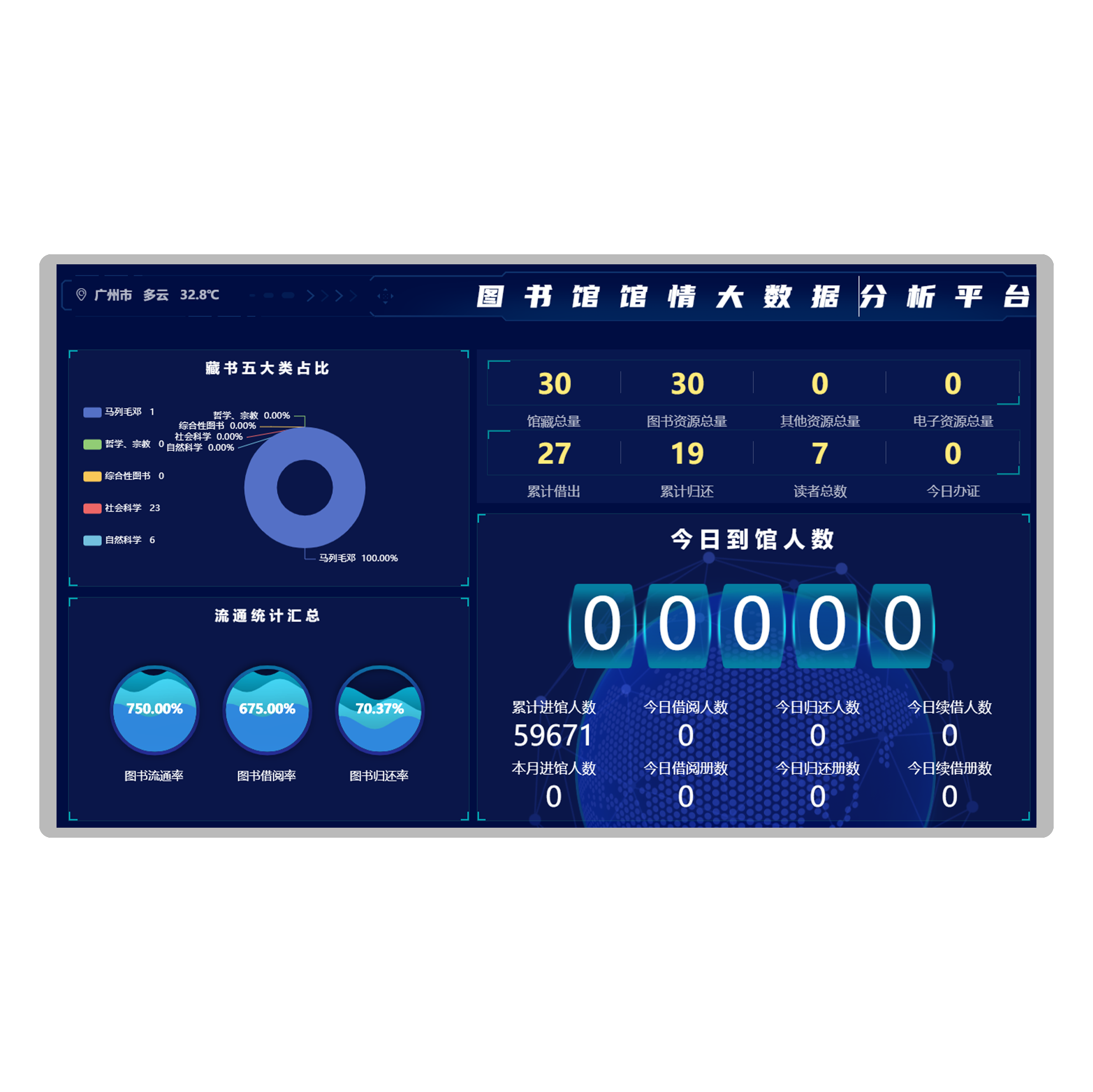 DGQZS43 / DGQZS56 大数据馆情展示平台能直观了解图书馆的借还书情况各个分馆之间的借阅 排行量,总借阅量、总办证量减少图书馆管理员去统计各馆借阅量的时间 , 有效提高图书馆的工作效 率及服务效率。能够实时编辑发布最新数据,实时展示图书馆进出馆人数、借阅排行榜、图书排行榜、 图书推荐、天气预报、图书馆资讯、名人名言等信息,还可以个性化定制信息展示。可用于图书档案、 金融通讯,影院 KTV、酒店餐饮、大型商超、政府、医疗医院、企业单位等场景。