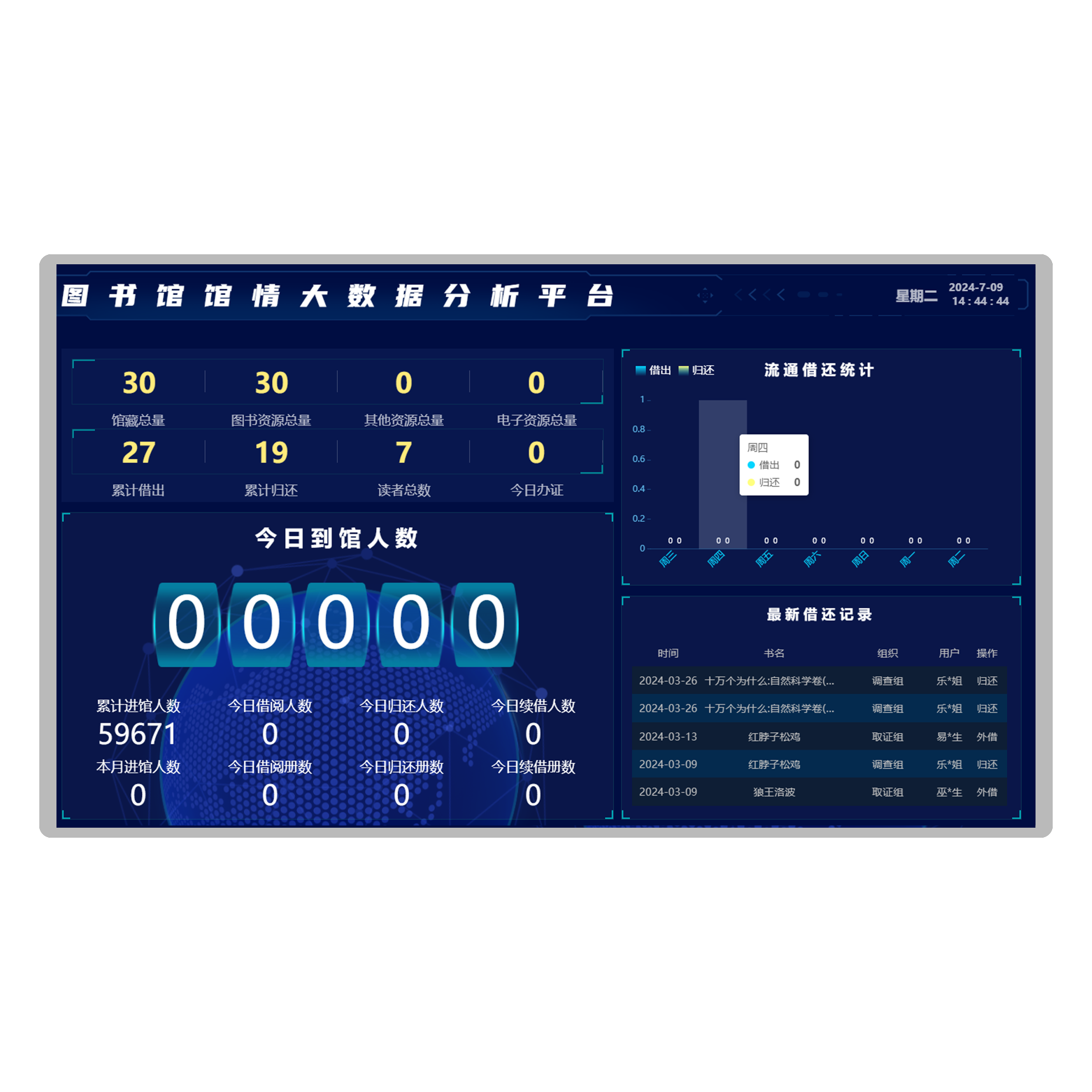★8、展示了今日到馆人数:记录当天图书馆的实际到馆人数,反映图书馆的人员流通使用情况。图书馆累计进馆人数,本月进馆人数,今日借阅人数,今日借阅册数,今日归还人数,今日归还册数,今日续借人数,今日续借册数。